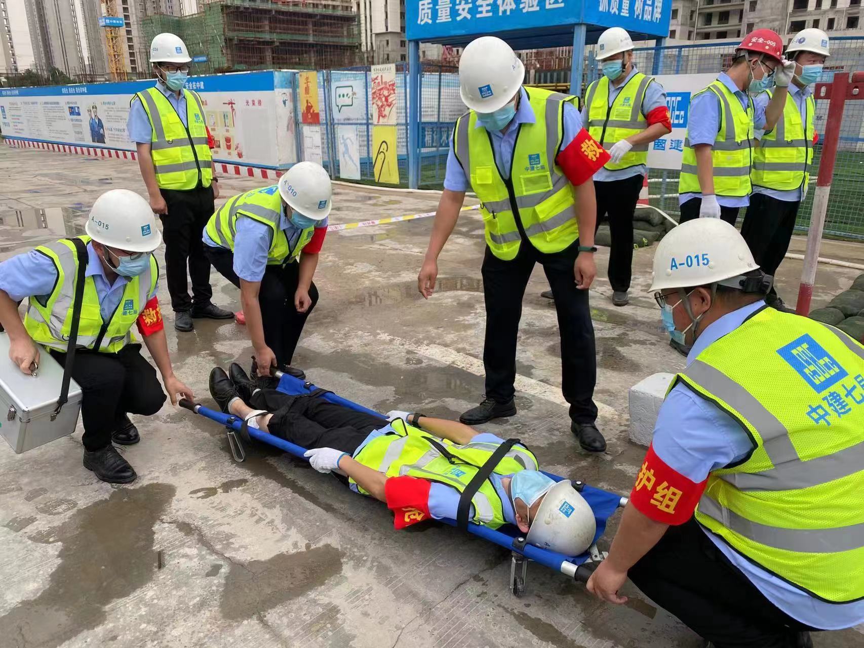 防汛应急演练从实战出发,模拟场景是积水倒灌基坑。只见工地基坑积水过膝,且场区坡道部分降水持续流入基坑,基坑抢险过程中,一名人员不幸腿部受伤,现场惊险、混乱。险情出现,项目人员立即启动防汛抢险应急预案,用防汛沙袋封堵坡道口,水泵抽水,并对伤者开展组织救援。项目人员紧密配合,各负其责,高效圆满完成了各个环节任务。