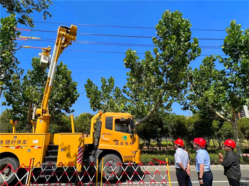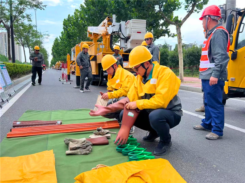 当日下午,在中心城区武盛大道南段,国网周口供电公司工作人员严格按照标准化作业流程,穿戴绝缘服、绝缘安全帽、绝缘手套等防护安全工器具,在黄色绝缘斗臂车“长臂”的助力下于高空中有序进行施工。