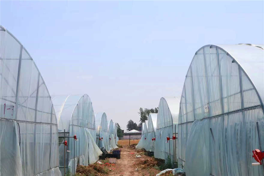 6月16日,在鹿邑县赵村乡梦祥现代农业专业合作社特色蜜瓜产业基地现场,一排排大棚整齐排列,村民正在大棚里忙碌着。