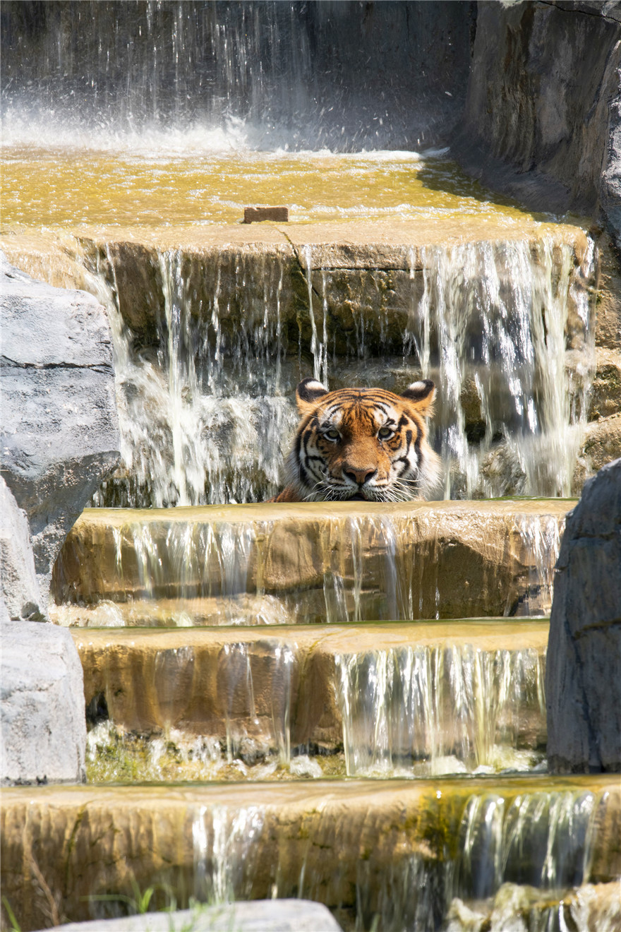 天气酷热,6月29日上午,记者在周口野生动物世界看到,狮子窝在山洞里不出来,老虎泡在水池里降温,河马在水世界过清爽生活,野鸭享受淋浴澡,丹顶鹤在树荫下享清凉。