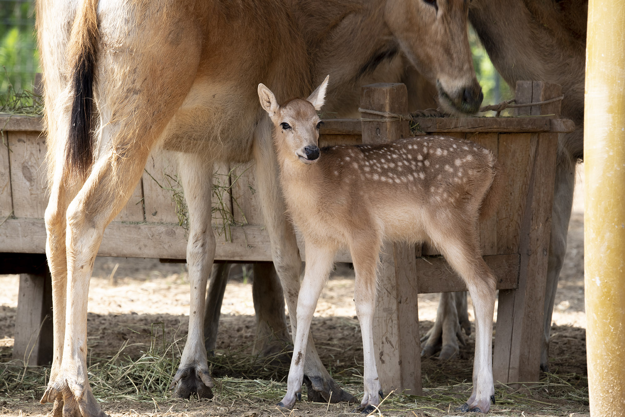 刚出生不久的小麋鹿依偎在“妈妈”身边