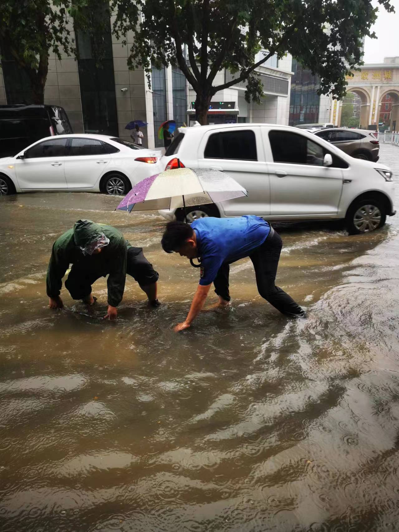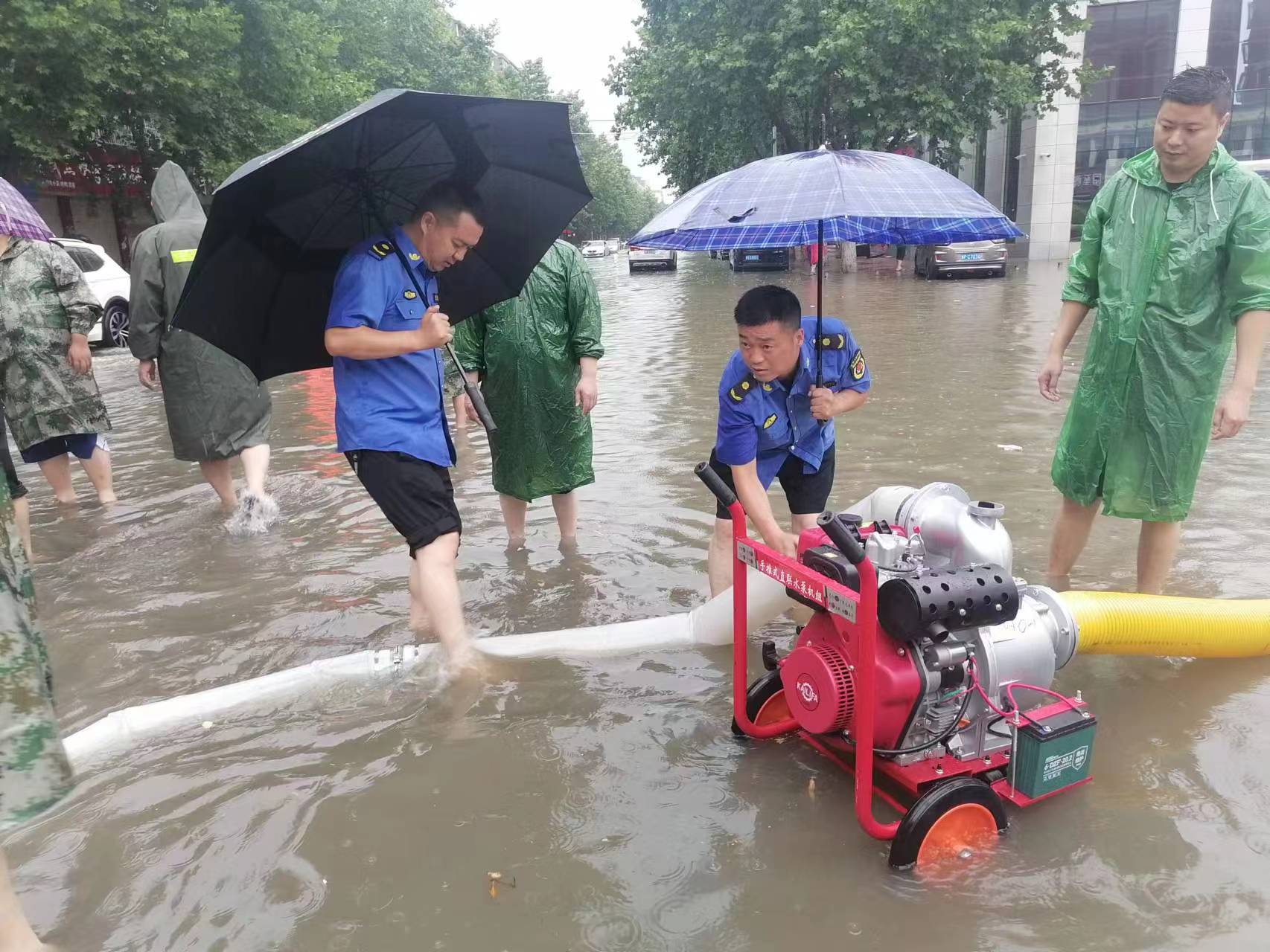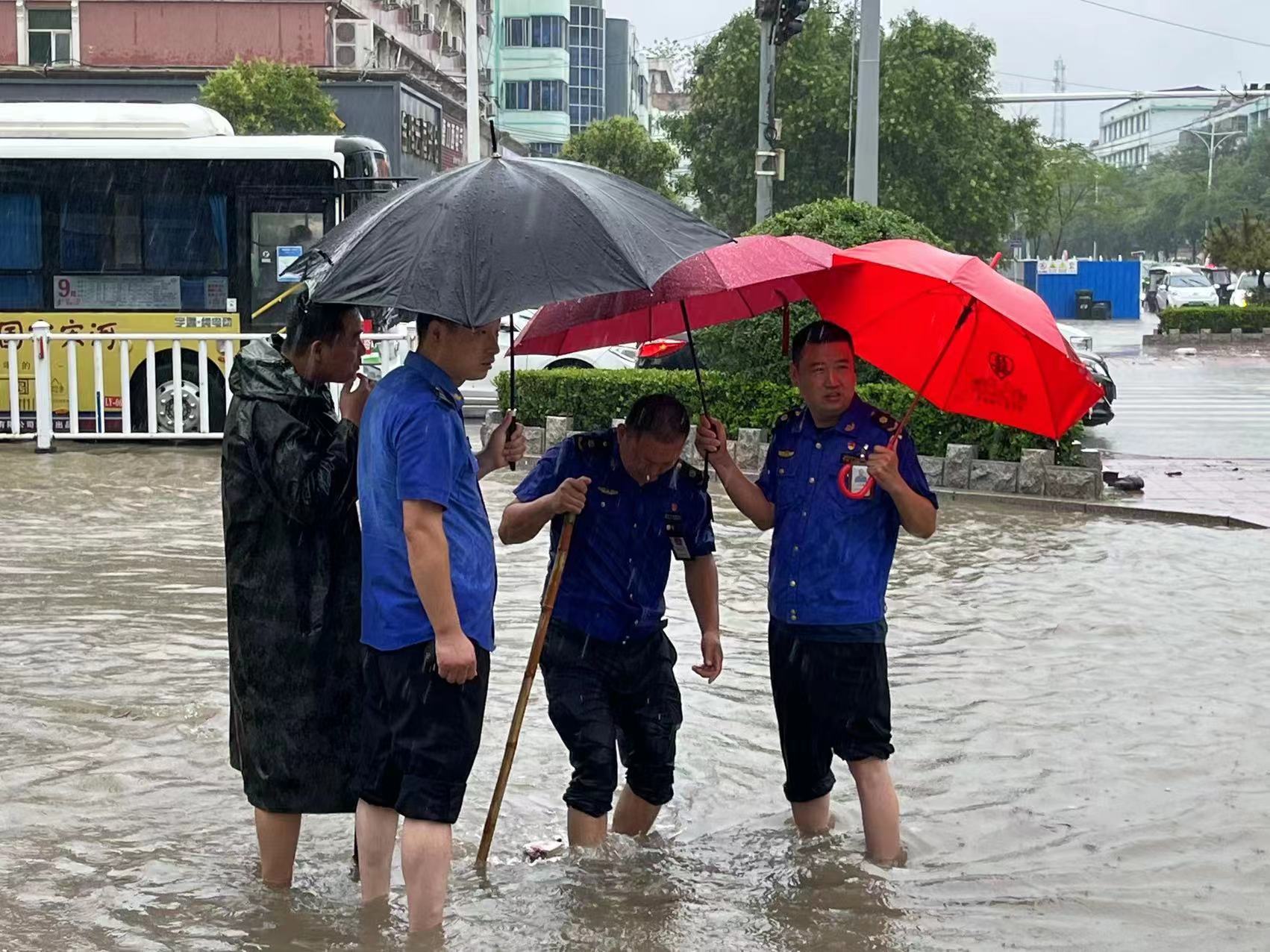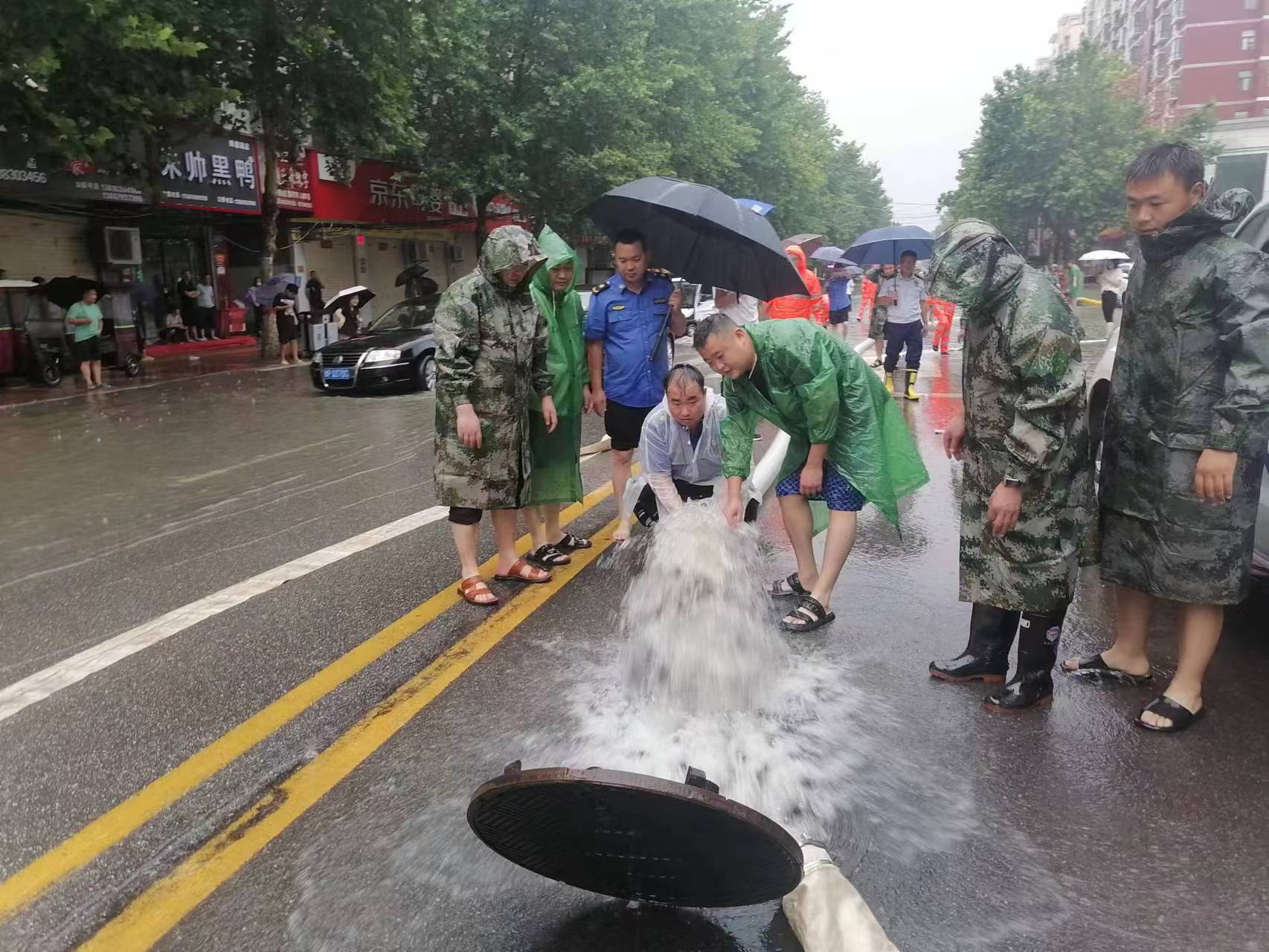 7月5日凌晨5时,鹿邑县气象台发布“暴雨橙色预警信号”后,暴雨骤至,该县城管局为全面做好各积水点排涝抢险工作,最大程度减少积水对市民出行的影响,确保辖区居民生命财产安全,及时组织抢险应急人员,带着排水机械,分组奔赴各路段(社区)积水点抢险救援,或冒雨抽排积水,或赤脚弯腰下手清理雨水箅子,或帮助过路行人推车安全助行。他们在暴雨中坚守的身影,成为一道充满温情的美丽风景,用实际行动践行了“为人民管好城市,做人民满意城管”的初心使命、责任担当和服务理念。③11