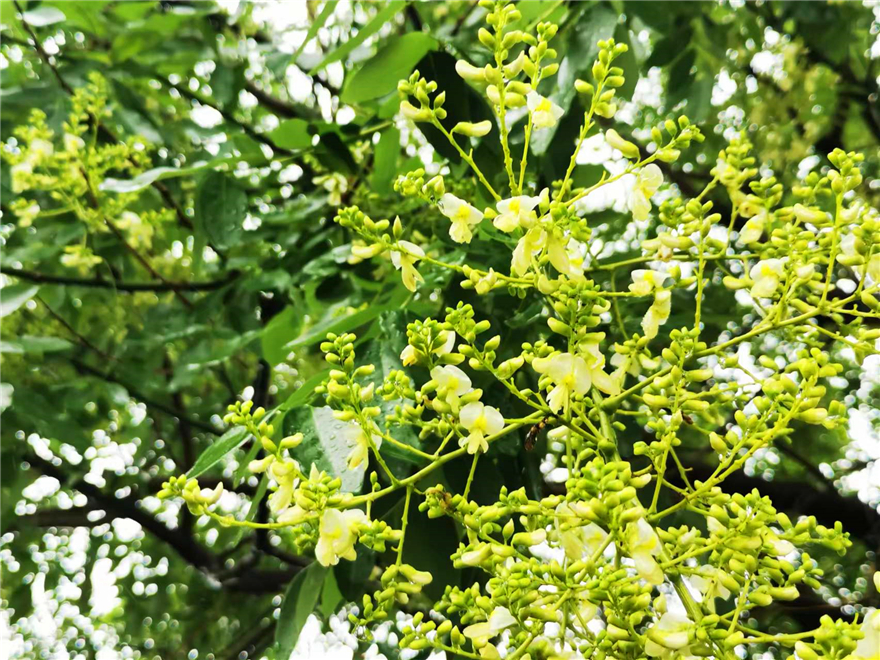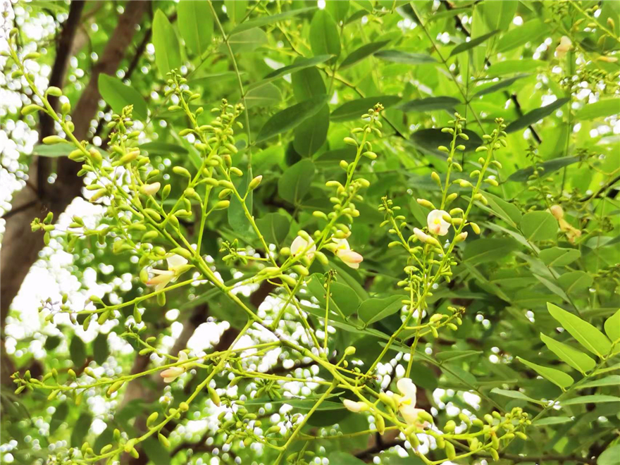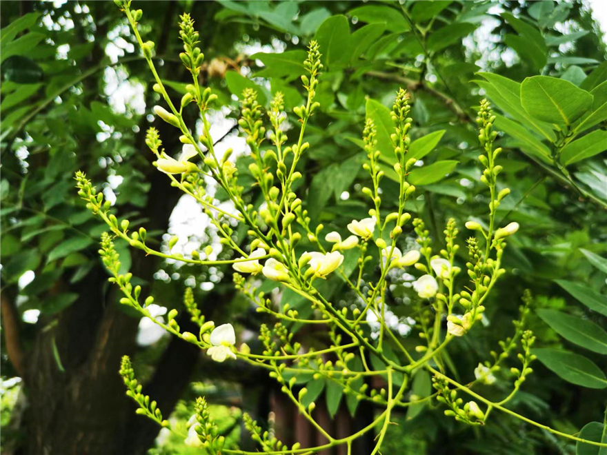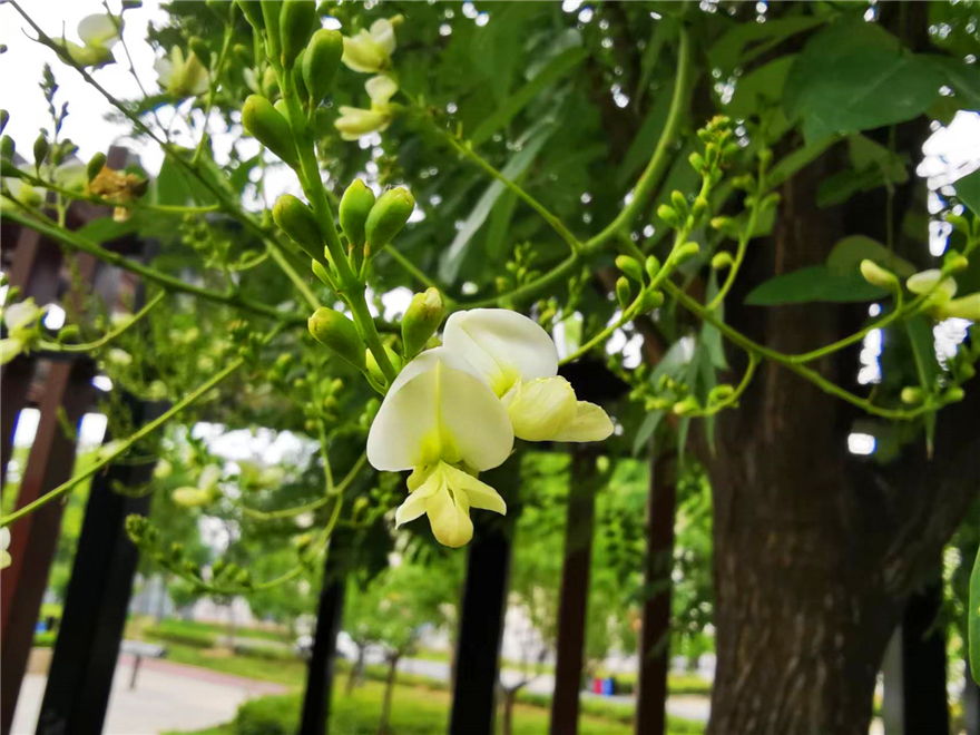 目前,市区铁路公园和和谐广场上的国槐开花了,给炎热的夏季带来了丝丝凉意和淡淡清香。