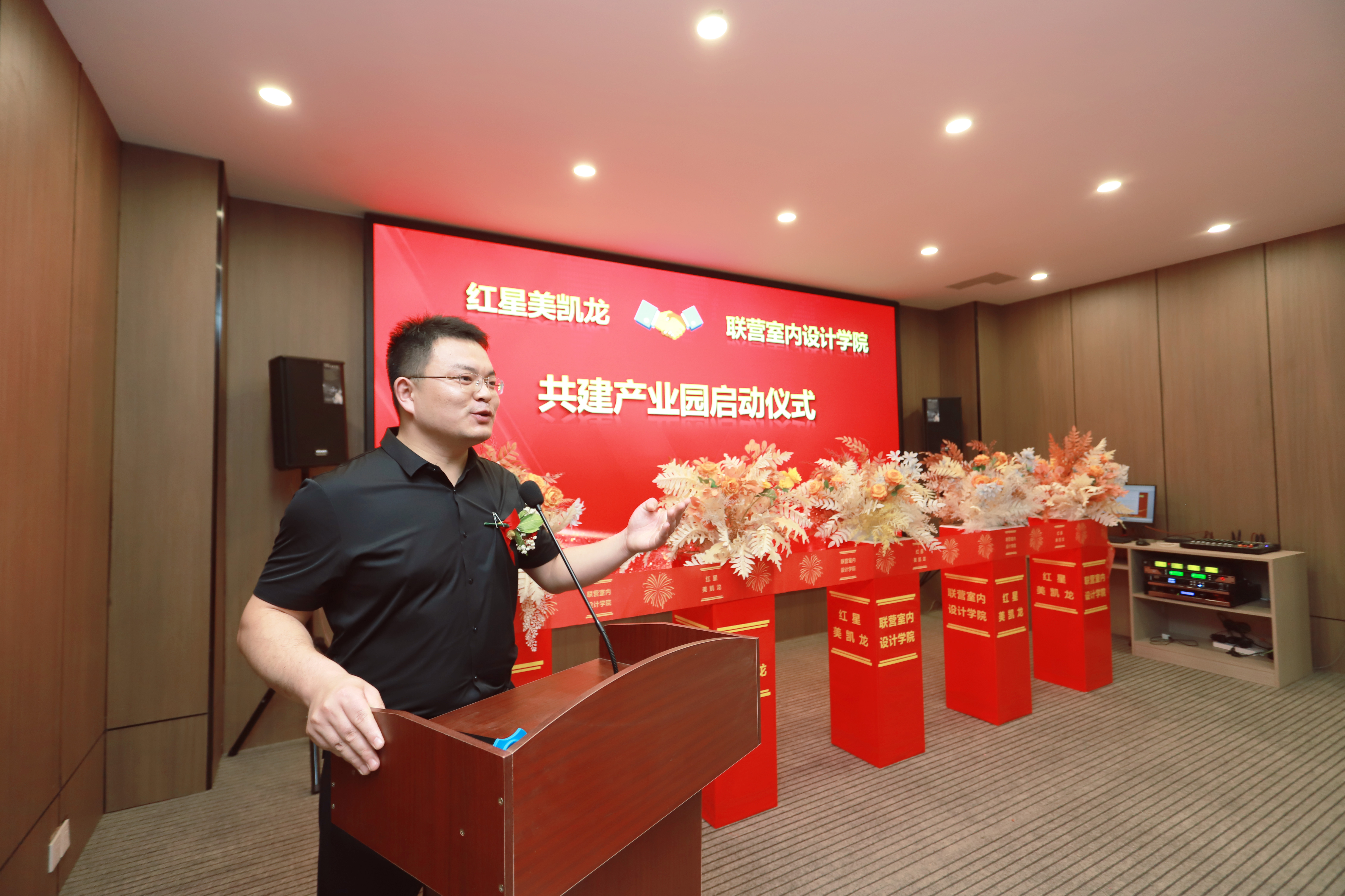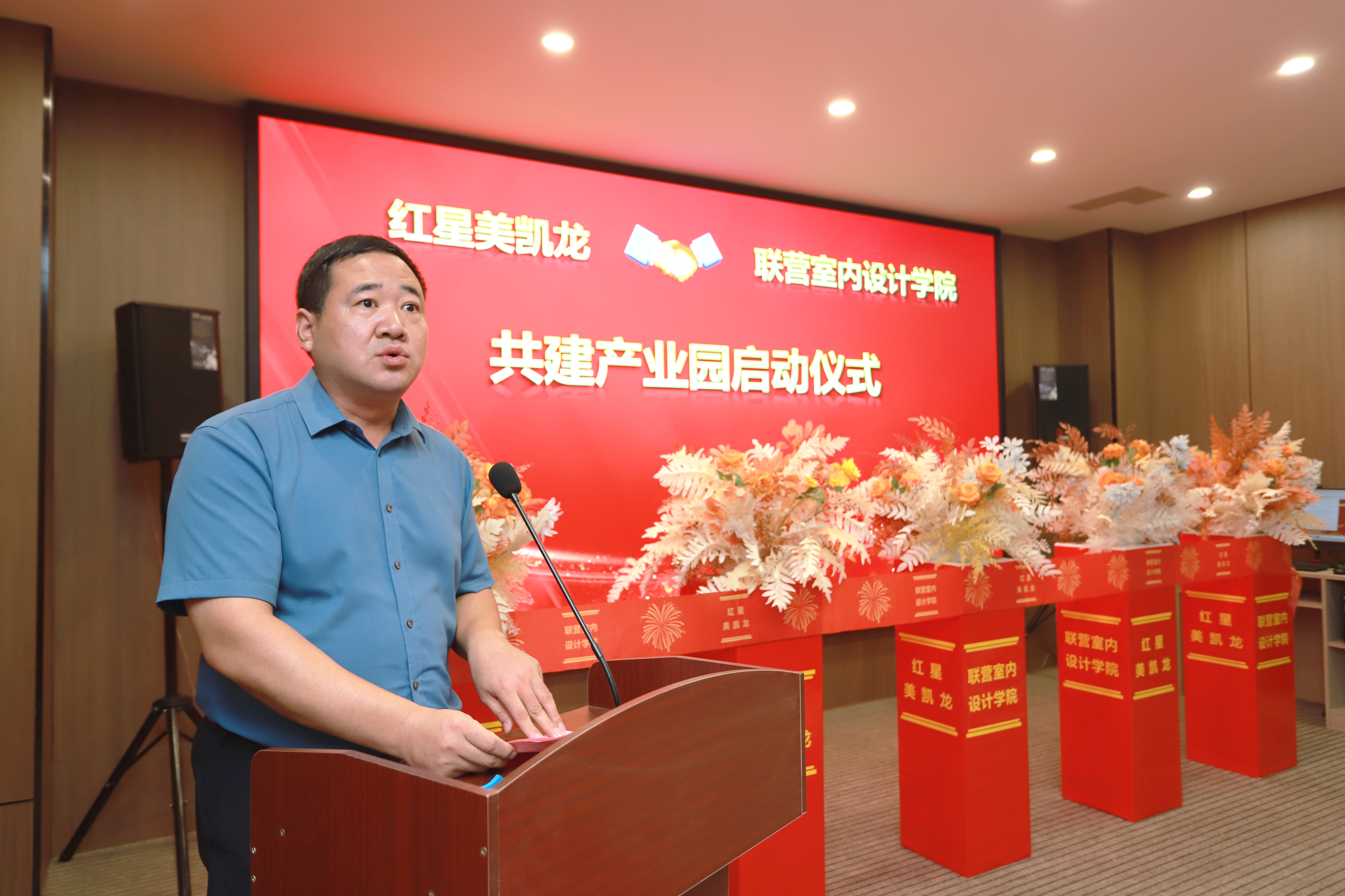 周口交通技师学院校长侯营坡致欢迎辞,他表示联营室内设计学院和红星美凯龙共建产业园是全面贯彻落实市委、市政府科教兴市、人才强市战略,着力打造全市职业教育创新发展高地的重要举措,是进一步深化“产教融合校企合作”、为地方经济发展服务、拓宽校企共同培养技能型人才模式的战略合作成果。侯营坡对周口联营室内设计学院的发展历史、师资规模、学科设置等作了简单介绍,并对共建产业园提出了思路及工作展望。他说,今天红星美凯龙带领十五家国内外家居行业知名品牌集体入驻联营室内设计学院共建产业园,不仅可以让学生接触到更多的高端品牌、认识更多种类的装修材质、了解国内先进的设计风格和装饰工艺。还可以通过企业老总和专家定期到学院的工匠大讲堂为学生授课,让学生及时了解室内设计行业的最新动态、最新理念、最新工艺,校企合作协同育人,把学生打造成技术技能好、综合素质高、责任意识强,企业喜欢用、用得上、留得住的“又红又专”合格人才,更好地服务企业、服务社会、服务地方经济建设。