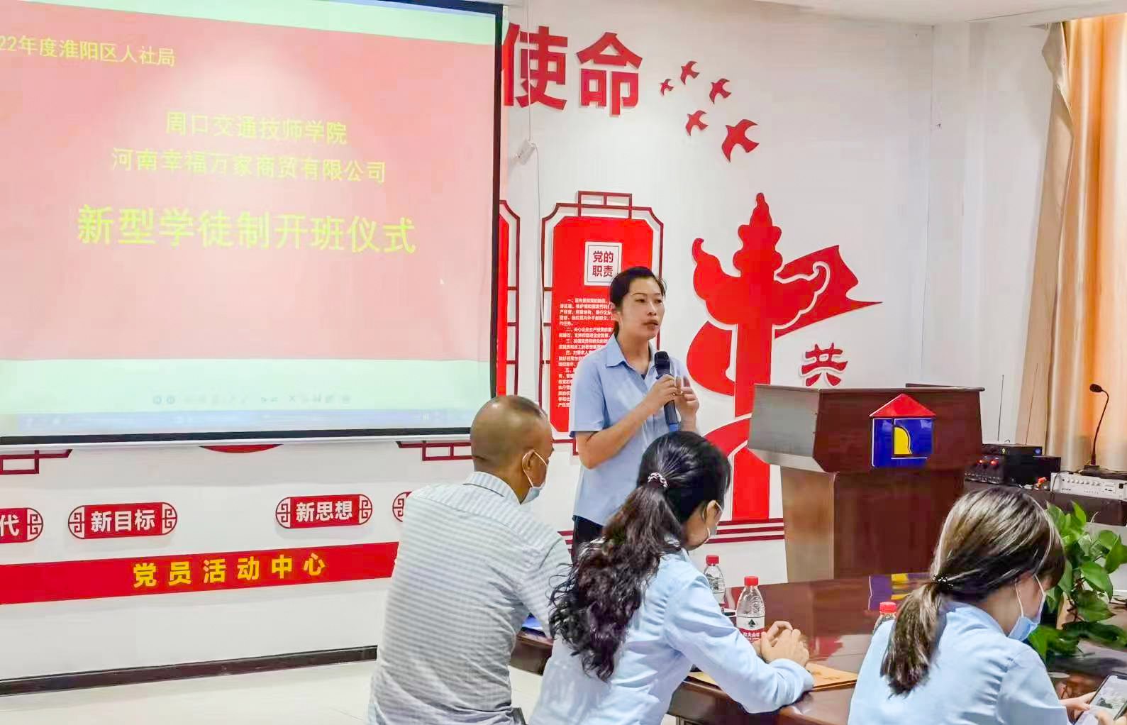 7月14日,由淮阳区人社局主导,周口交通技师学院与河南幸福万家商贸有限公司联合开办的“新型学徒制”培训班开班仪式顺利举行。淮阳区人社局职建股股长齐海洋、河南幸福万家商贸有限公司财务部长李宁、周口交通技师学院培训处主任李志丹出席本次会议。