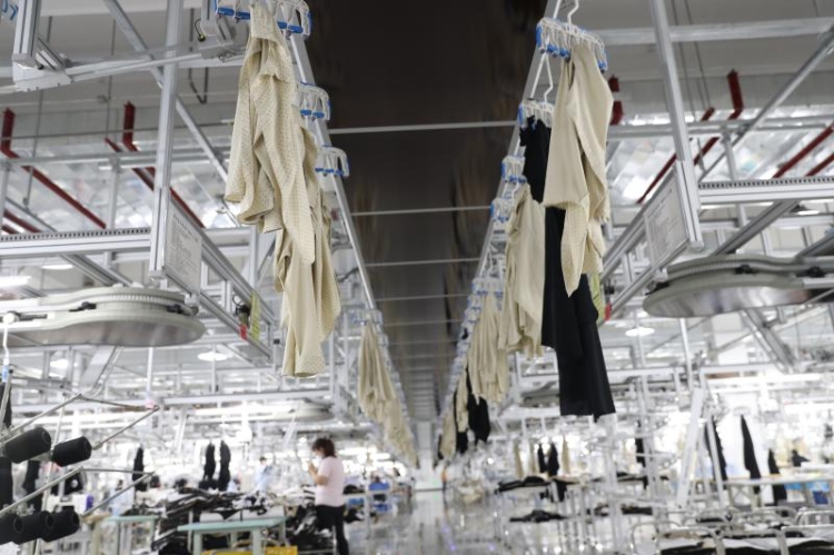 当自动码布机将数十层布料送至智能裁床,经过电脑激光切割,数十层衣片一会儿就裁好了。衣片按照不同品种和规格分类,被送到指定裁缝工位。工位上方,“智能吊挂系统”自动行进,将衣服的半成品传送到相应岗位。在工业园的“作战室”里,LED屏上滚动播放任务汇总数据、产品汇总数据、当下品质最差员工、当下等待时间最长员工等。在成衣制作工人面前也有一面小屏展示着该员工工单信息、产量信息等。