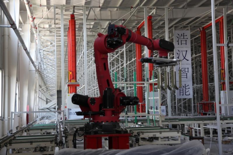 在盛泰纺织智能仓库,记者看到技术人员正忙着调试设备,工业机器人在调试中有条不紊地在进行作业。设备投入使用后,这里将是个无人仓库,实现自动进货、自动出货。过去1车30吨的货,10个人四五个小时才能完成装卸,现在1个机器人2小时内就能完成,既提高了工作效率,也大大节约了用工成本。