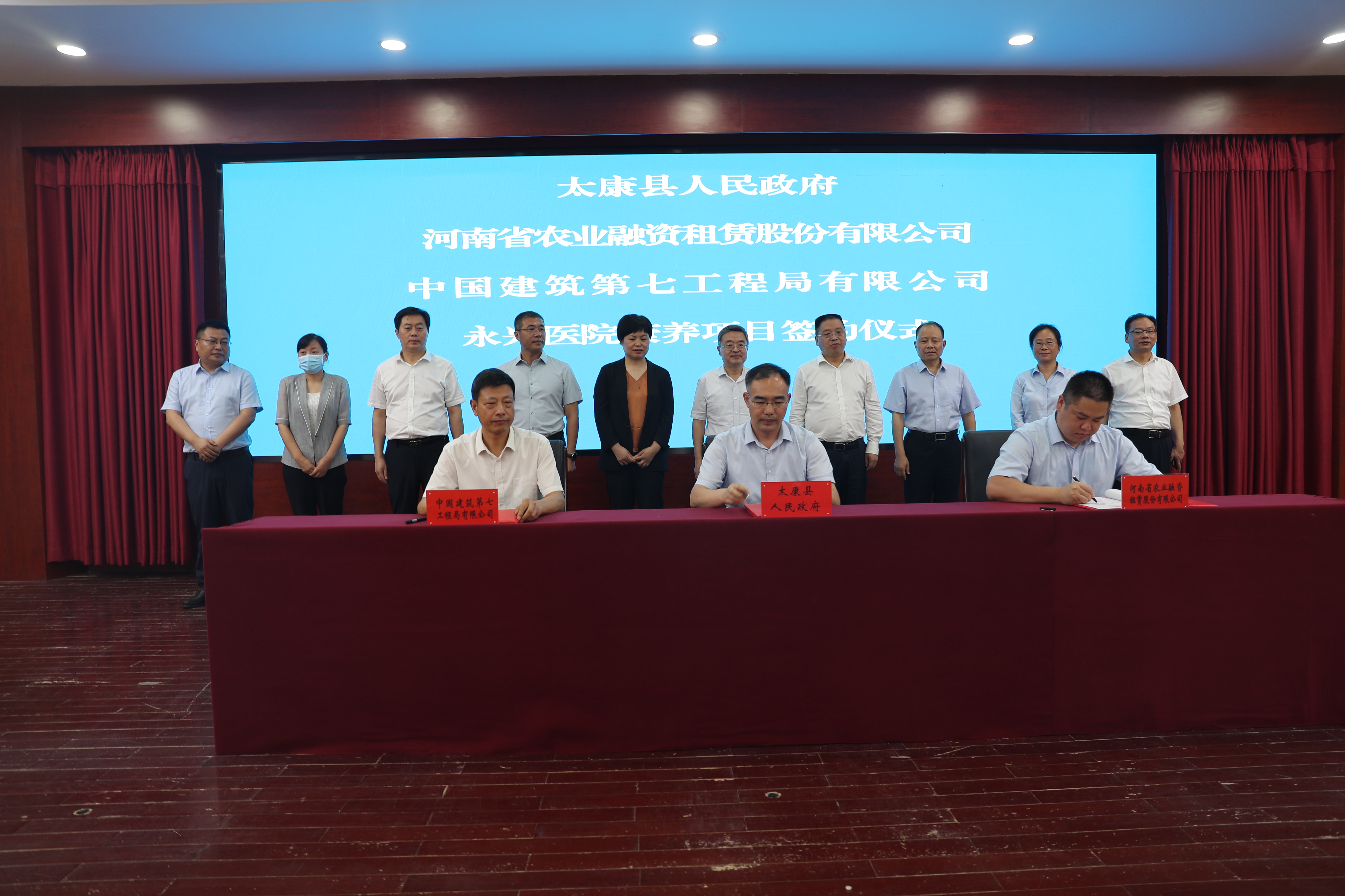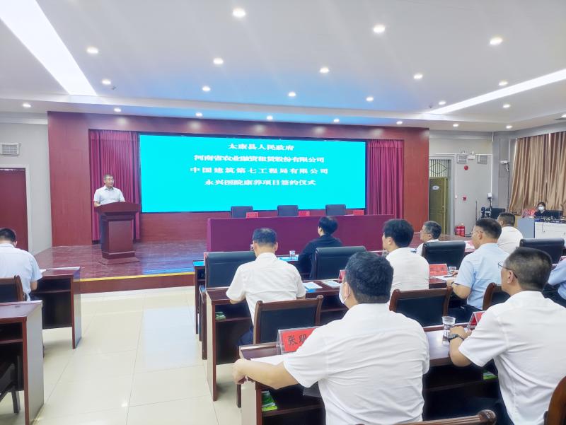 8月5日上午,太康县人民政府、河南省农业融资租赁公司、中国建筑第七工程局有限公司三方合作建设康养项目签约仪式举行。市委常委、太康县委书记皇甫立新出席仪式并致辞,河南省农业融资租赁股份有限公司董事长田清莹、中国建筑第七工程局有限公司副总经理鲍宗平出席仪式,县长张峰主持仪式,县领导张新栋、邓昌锋、张大华出席仪式。