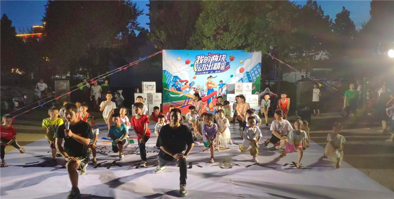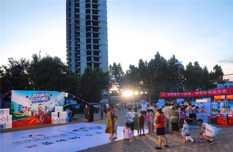 “清晨午后傍晚,跑步单杆转盘,伸伸腰腿筋骨,一起摇摇转转。仰卧起坐走起,引体向上拉满,人生怎能躺赢,练出六块腹肌看看……是谁让健身无处不在,要问那一张张公益体彩。”8月12日,在周口市川汇区联盟新城社区,伴随着动感歌舞,全民健身主题活动“我的两块 动出精彩”体彩社区运动会正式拉开序幕。