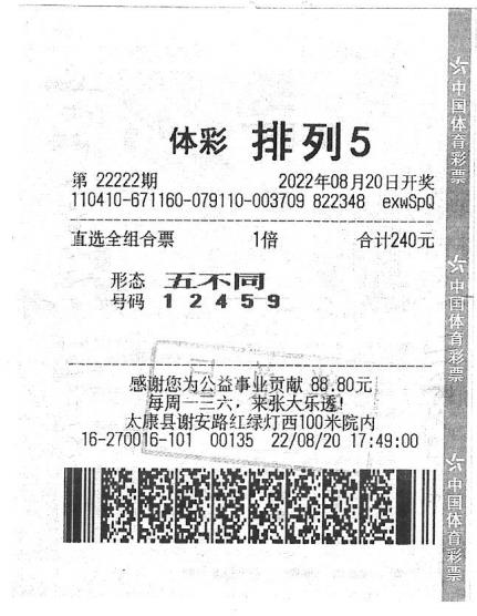 近日,河南周口太康县谢安路红绿灯西100米院内4116270016实体店的体彩中奖者来到周口体彩分中心领取了奖金。该注中奖彩票是直选全组合排列5游戏1注,累计投入240元,收获奖金10万元。