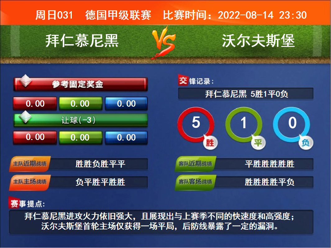 比赛时间:2022-08-14 23:30赛事提点:拜仁慕尼黑进攻火力依旧强大,且展现出与上赛季不同的快速度和高强度;沃尔夫斯堡首轮主场仅获得一场平局,后防线暴露了一定的漏洞。