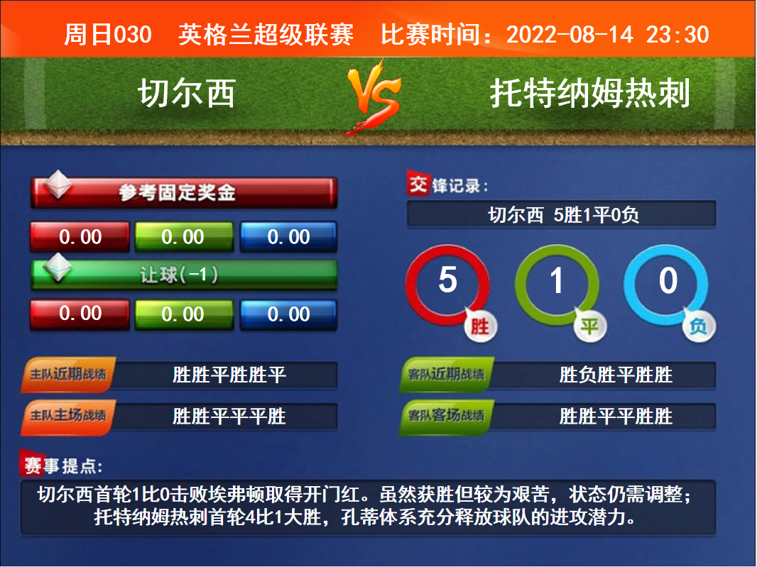 比赛时间:2022-08-14 23:30赛事提点:切尔西首轮1比0击败埃弗顿取得开门红。虽然获胜但较为艰苦,状态仍需调整;托特纳姆热刺首轮4比1大胜,孔蒂体系充分释放球队的进攻潜力。