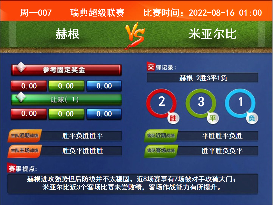 比赛时间:2022-08-16 01:00赛事提点:赫根进攻强势但后防线并不太稳固,近8场赛事有7场被对手攻破大门;米亚尔比近3个客场比赛未尝败绩,客场作战能力有所提升。