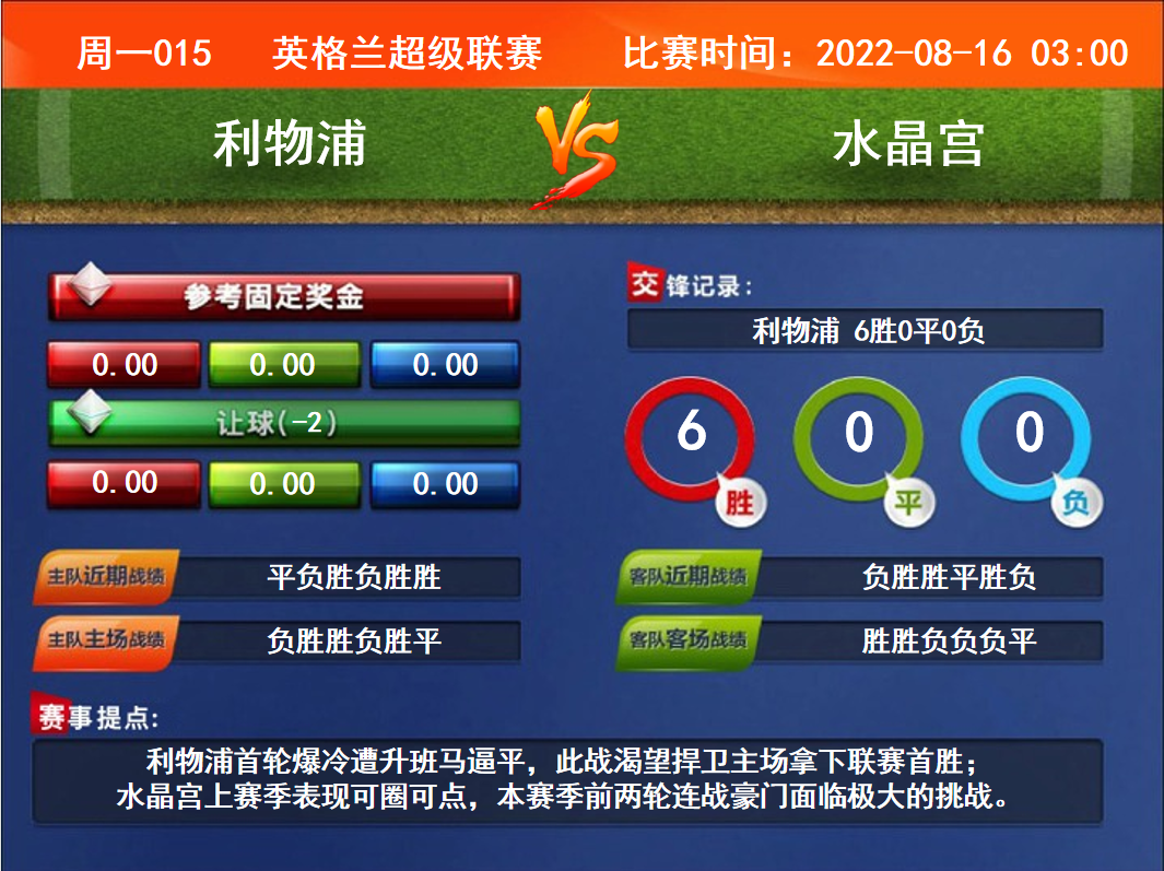 比赛时间:2022-08-16 03:00赛事提点:利物浦首轮爆冷遭升班马逼平,此战渴望捍卫主场拿下联赛首胜;水晶宫上赛季表现可圈可点,本赛季前两轮连战豪门面临极大的挑战。