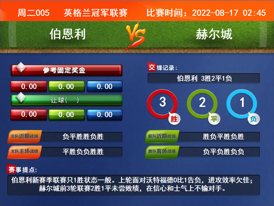 比赛时间:2022-08-17 02:45赛事提点:伯恩利新赛季联赛只1胜状态一般。上轮面对沃特福德0比1告负,进攻效率欠佳;赫尔城前3轮联赛2胜1平未尝败绩,在信心和士气上不输对手。