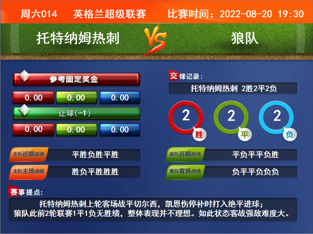 比赛时间:2022-08-20 19:30赛事提点:托特纳姆热刺上轮客场战平切尔西,凯恩伤停补时打入绝平进球;狼队此前2轮联赛1平1负无胜绩,整体表现并不理想。如此状态客战强敌难度大。