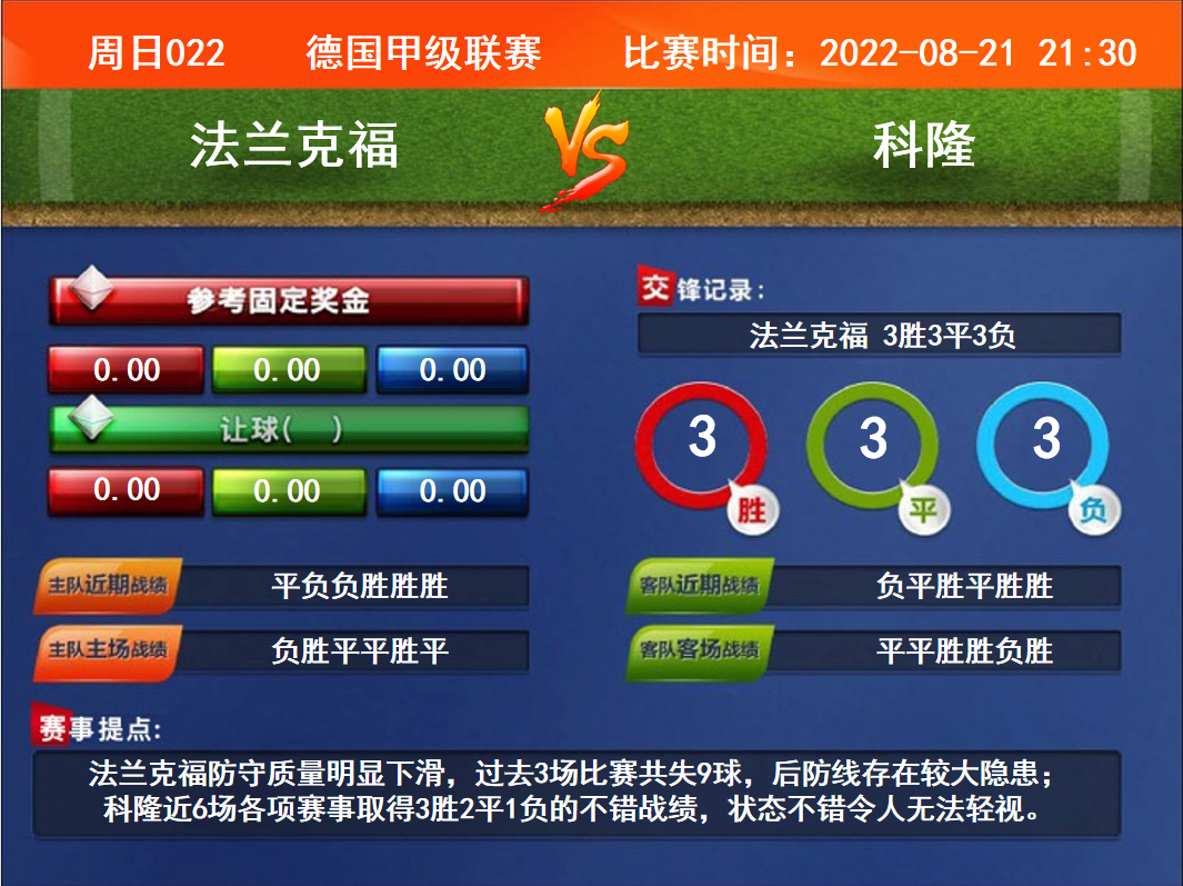 比赛时间:2022-08-21 21:30赛事提点:法兰克福防守质量明显下滑,过去3场比赛共失9球,后防线存在较大隐患;科隆近6场各项赛事取得3胜2平1负的不错战绩,状态不错令人无法轻视。