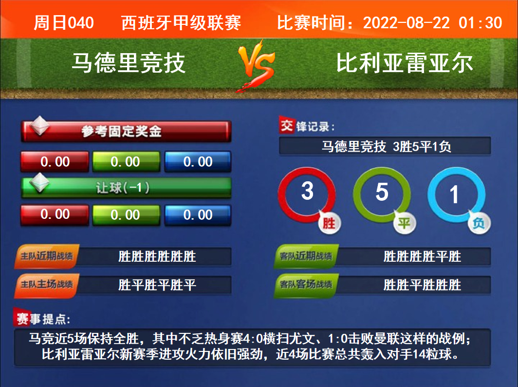 比赛时间:2022-08-22 01:30赛事提点:马竞近5场保持全胜,其中不乏热身赛4:0横扫尤文、1:0击败曼联这样的战例;比利亚雷亚尔新赛季进攻火力依旧强劲,近4场比赛总共轰入对手14粒球。