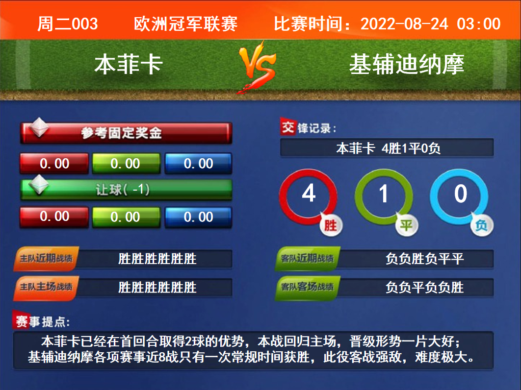 比赛时间:2022-08-24 03:00赛事提点:本菲卡已经在首回合取得2球的优势,本战回归主场,晋级形势一片大好;基辅迪纳摩各项赛事近8战只有一次常规时间获胜,此役客战强敌,难度极大。