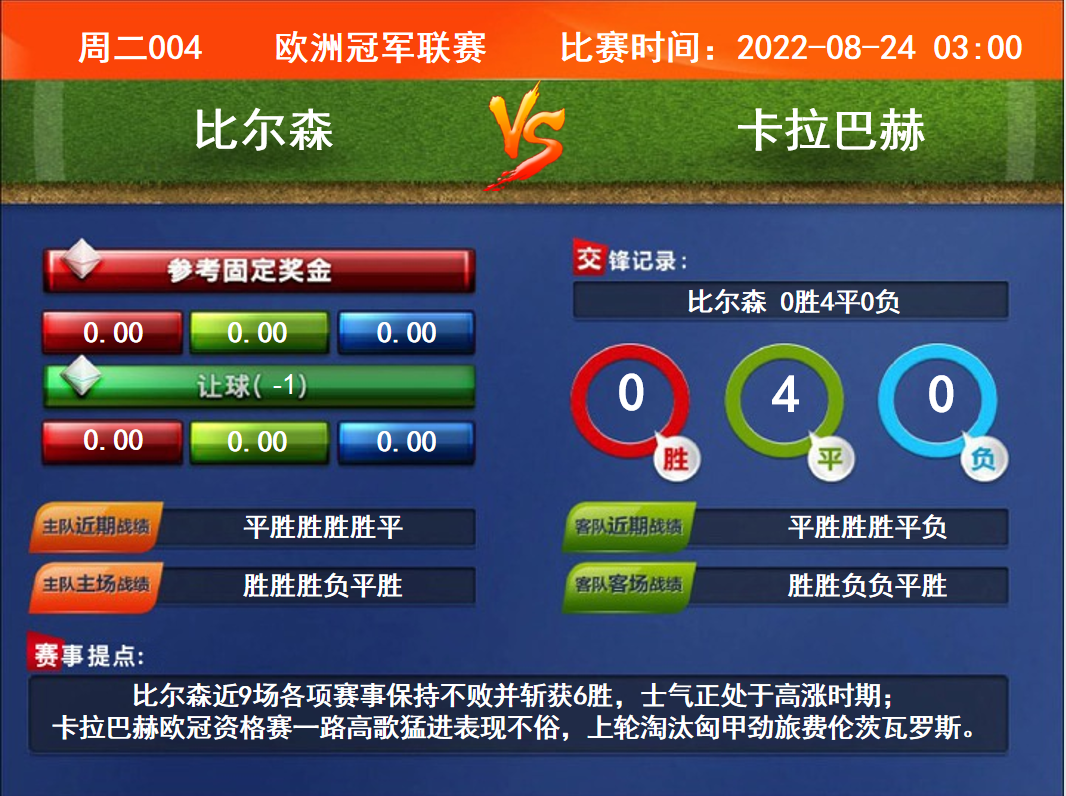 比赛时间:2022-08-24 03:00赛事提点:比尔森近9场各项赛事保持不败并斩获6胜,士气正处于高涨时期;卡拉巴赫欧冠资格赛一路高歌猛进表现不俗,上轮淘汰匈甲劲旅费伦茨瓦罗斯。