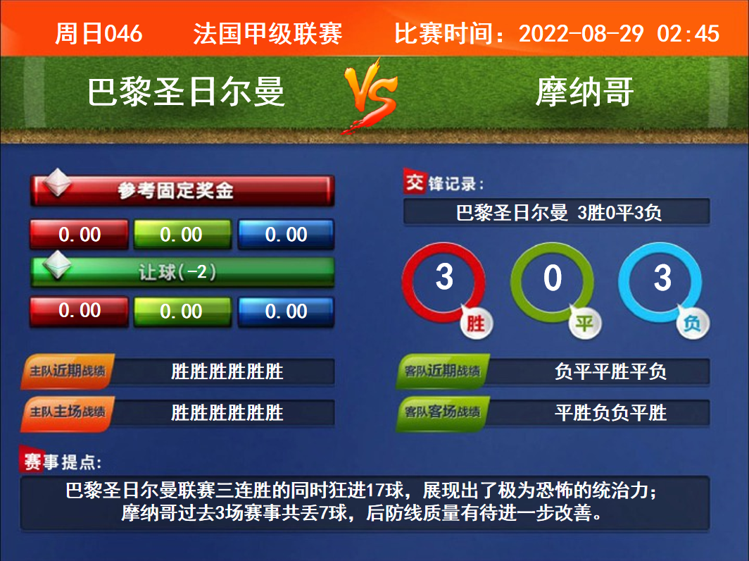 比赛时间:2022-08-29 02:45赛事提点:巴黎圣日尔曼联赛三连胜的同时狂进17球,展现出了极为恐怖的统治力;摩纳哥过去3场赛事共丢7球,后防线质量有待进一步改善。