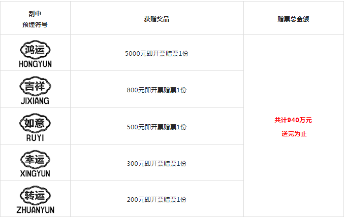 活动期间,购彩者在我省任一体彩销售实体店购买指定活动票种,若单张彩票刮中符合奖励条件的预埋符号,经实体店终端兑奖设备(IVT或BCR)成功完成奖金兑付(如中奖)及促销兑奖扫描后,即可获得即开票赠票奖品一份。总额有限,送完为止,详见下表: