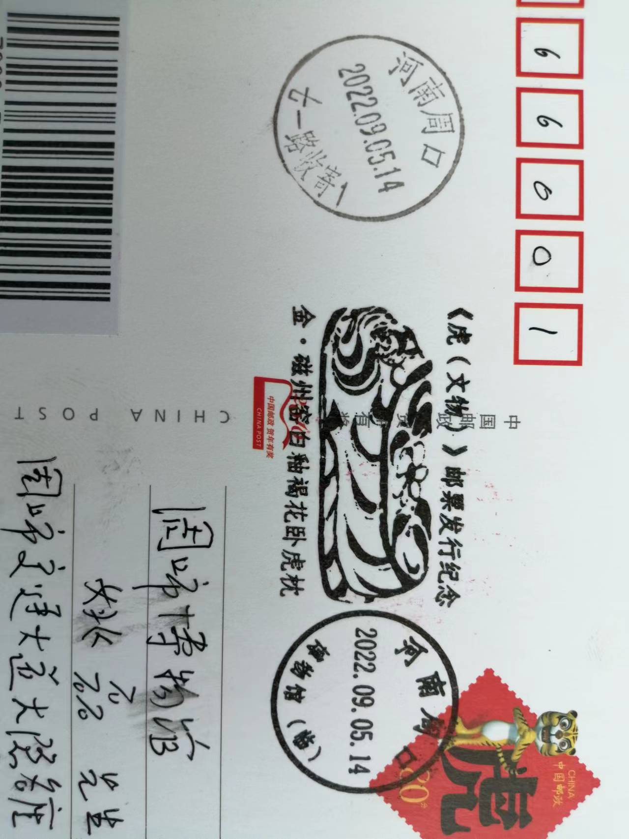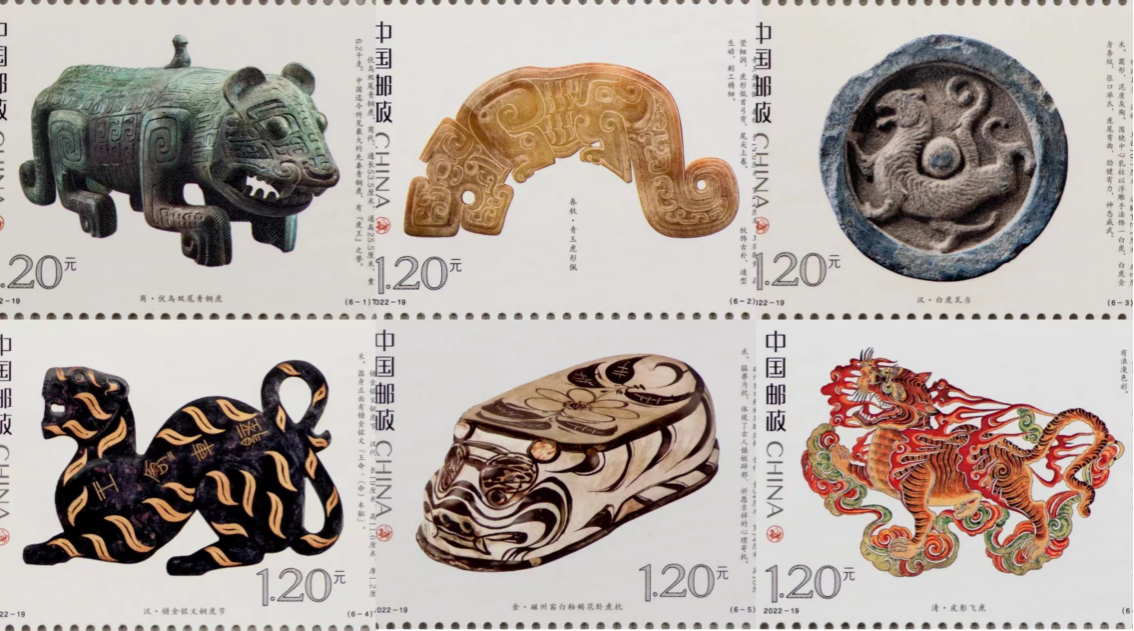 9月5日,由中国邮政特别制作的《虎文物》特种邮票正式发行。此套邮票共有6枚,每枚上都印有一件珍贵的虎文物。邮票图案名称分别为“商·伏鸟双尾青铜虎”“春秋·青玉虎形佩”“汉·白虎瓦当”“汉·错金铭文铜虎节”“金·磁州窑白釉褐花卧虎枕”“清·皮影飞虎”。其中第五枚邮票图案中的“金·磁州窑白釉褐花卧虎枕”就是来自周口市博物馆的珍贵文物,该邮票运用光油和浮雕击凸工艺,塑造了虎安详、可爱的形象。