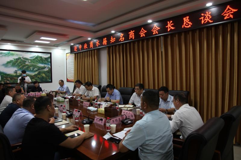 惠风和畅,丹桂飘香。9月7日上午,商水县迎中秋商水籍知名商会会长恳谈会在县委二楼会议室温馨举行,来自北京、内蒙古、上海、郑州等地的知名商会会长相聚家乡,共享秋之美景、共谋发展大计、共绘美丽蓝图。商水县委书记孔阳,县委副书记、县长沈宗祥,县委常委、统战部部长王建党,县人大常委会副主任姜军,副县长王宾,县政协副主席刘万华,县政协副主席、工商联主席彭发光等参加活动。
