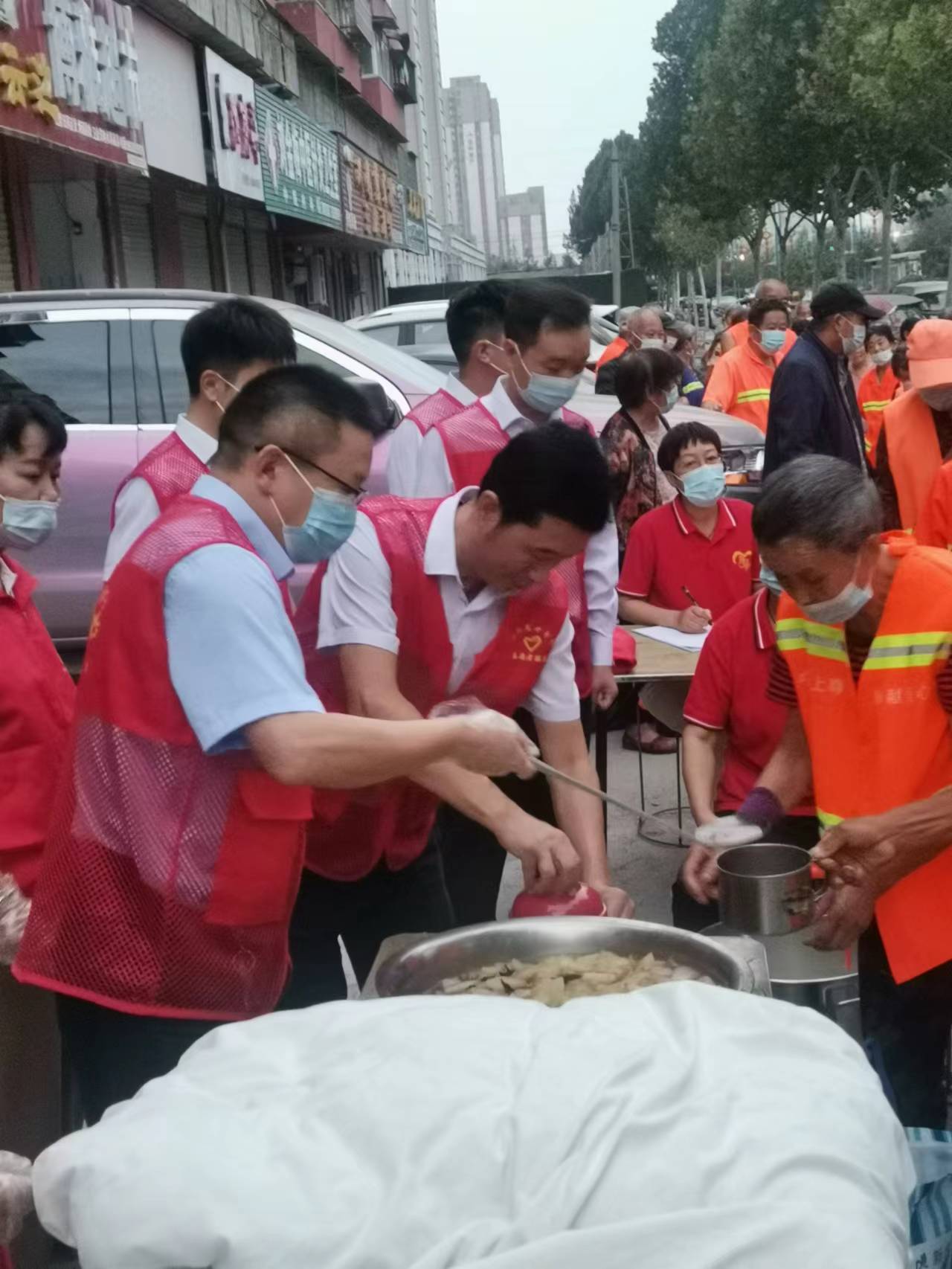 9月8日早上5点,该行爱心志愿者带着口罩、米、面、油、牛肉、月饼等慰问品,来到文昌大道爱心粥屋,大家分工合作,熬粥、蒸馒头、炒菜、搬桌子、摆椅子,为排队等待就餐的环卫工人盛饭、打菜、发放口罩,并向他们送上节日祝福。环卫工人们就餐结束后,志愿者们及时清洗碗筷餐具,整理桌椅,打扫现场卫生,忙碌而有序。