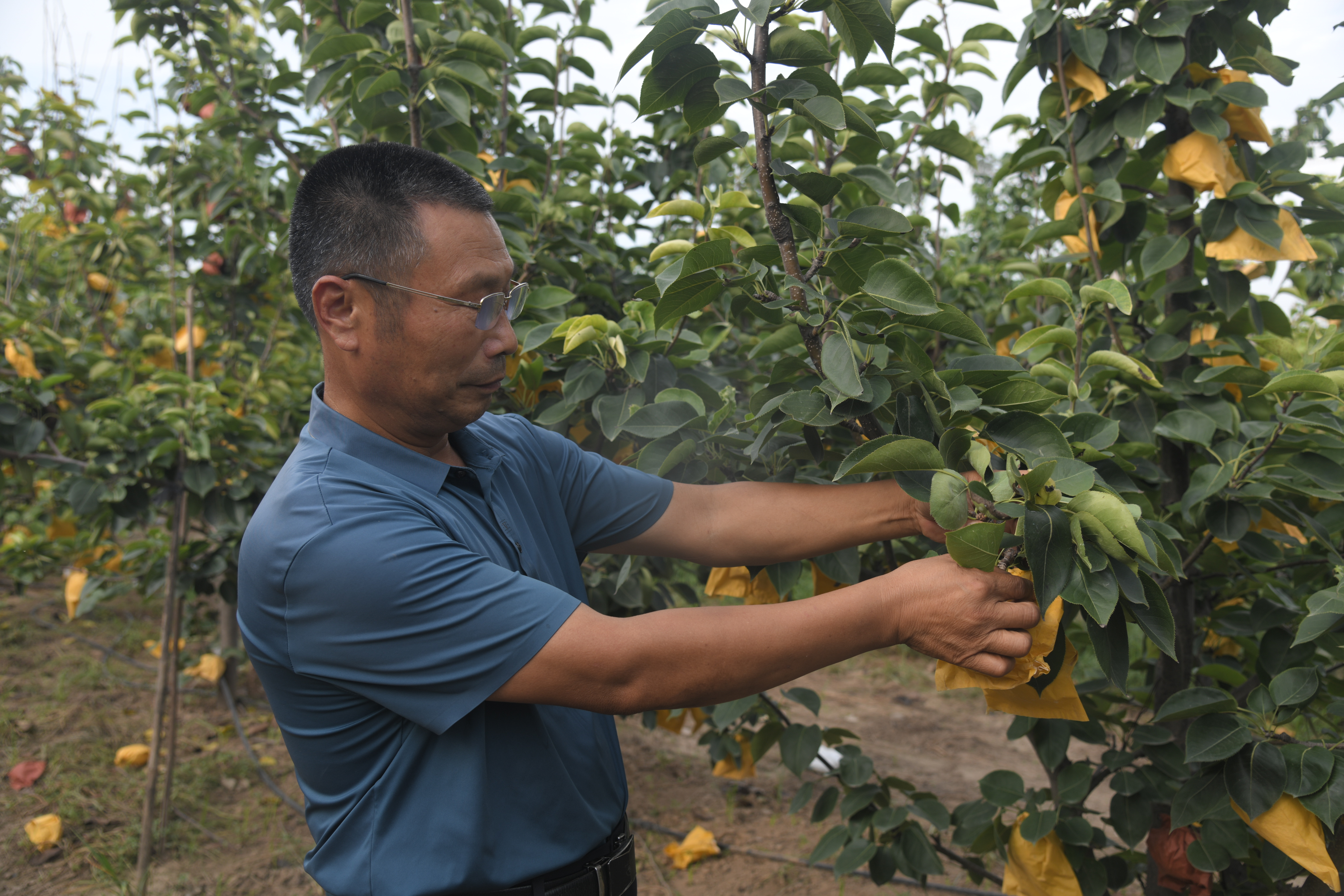 在黄泛区兴隆种植专业合作社种植基地,理事长李富国从树枝上摘下一颗黄金梨,边去掉套袋边向大家展示。