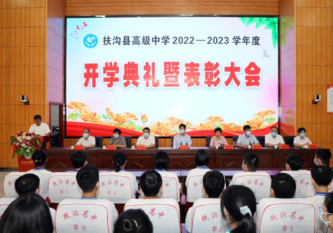 9月15日下午,扶沟高中举行2022-2023学年度开学典礼暨表彰大会,县领导崔卫国、张雪芳、郑峰、蔡广、孙春花及县政府办公室主任李红杰、县教体局局长葛伟、扶沟高中校长冯凤云等出席开学典礼。