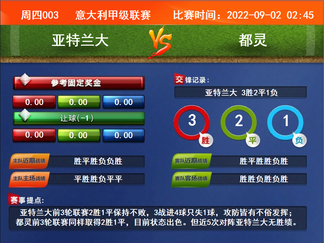 比赛时间:2022-09-02 02:45赛事提点:亚特兰大前3轮联赛2胜1平保持不败,3战进4球只失1球,攻防皆有不俗发挥;都灵前3轮联赛同样取得2胜1平,目前状态出色。但近5次对阵亚特兰大无胜绩。