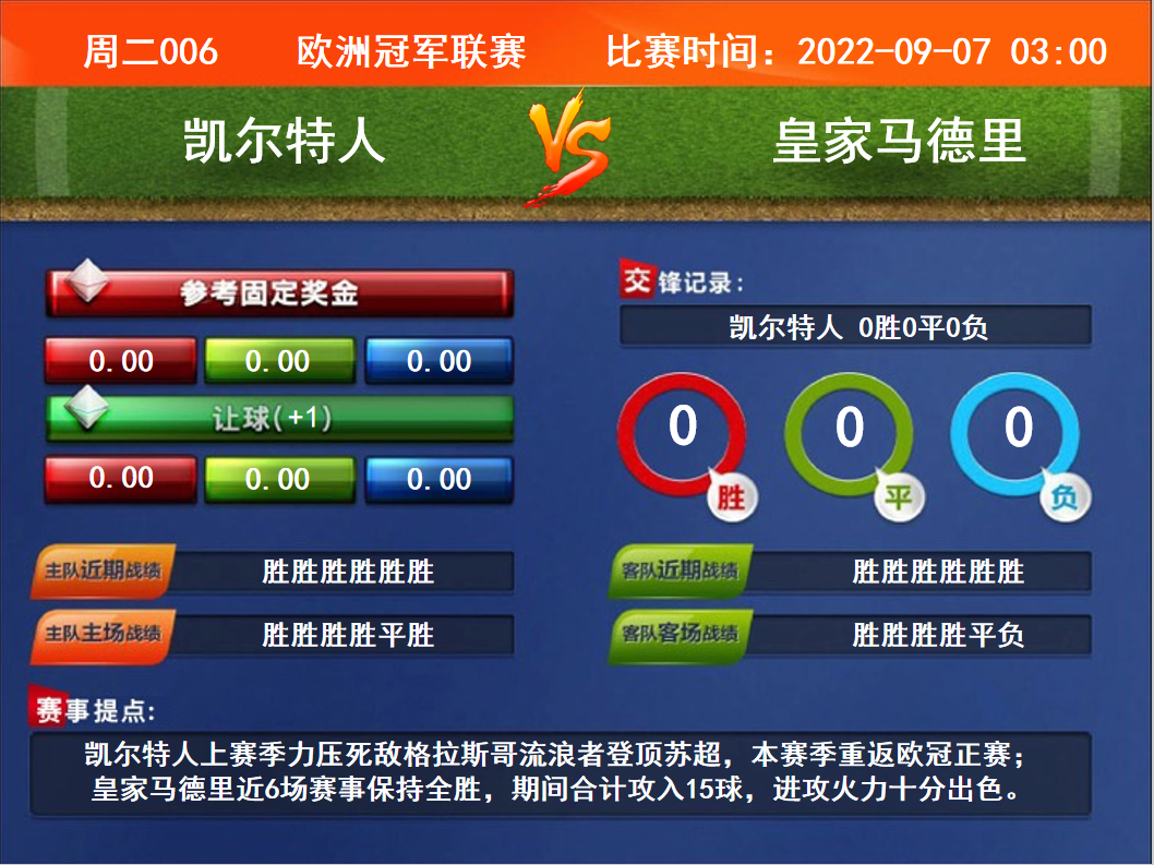 比赛时间:2022-09-07 03:00赛事提点:凯尔特人上赛季力压死敌格拉斯哥流浪者登顶苏超,本赛季重返欧冠正赛;皇家马德里近6场赛事保持全胜,期间合计攻入15球,进攻火力十分出色。