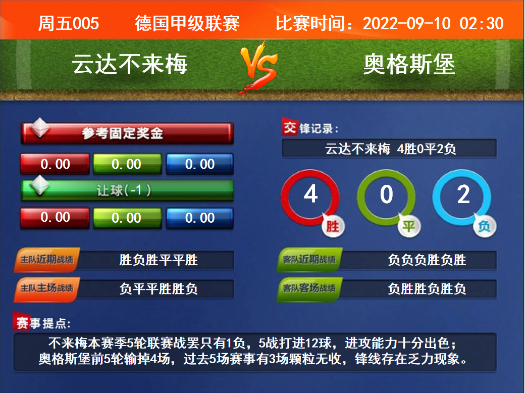 比赛时间:2022-09-10 02:30赛事提点:不来梅本赛季5轮联赛战罢只有1负,5战打进12球,进攻能力十分出色;奥格斯堡前5轮输掉4场,过去5场赛事有3场颗粒无收,锋线存在乏力现象。
