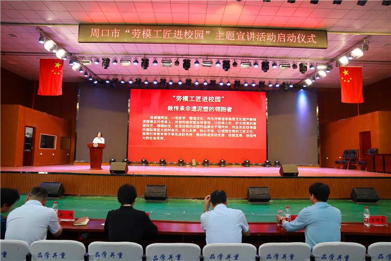 9月28日上午,“中国梦·劳动美——喜迎二十大 奋进新征程”——周口市“劳模工匠进校园”主题宣讲活动启动。市总工会组织劳模工匠到周口市技师学院开展宣讲活动,该校450多名师生聆听宣讲报告。周口市劳动模范、周口大工匠、郸城县泥塑艺术大师张振福应邀为师生作了首场宣讲。