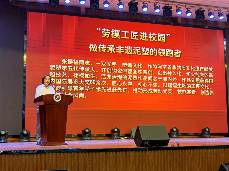 张振福为周口市技师学院的师生分享了他的成长经历和耐住寂寞、执着追求泥塑艺术、无私奉献的劳模精神,并向师生分享了前几天他的泥塑作品在广西桂林国际会展中心参加中国—东盟博览会旅游展引起的强烈反响。