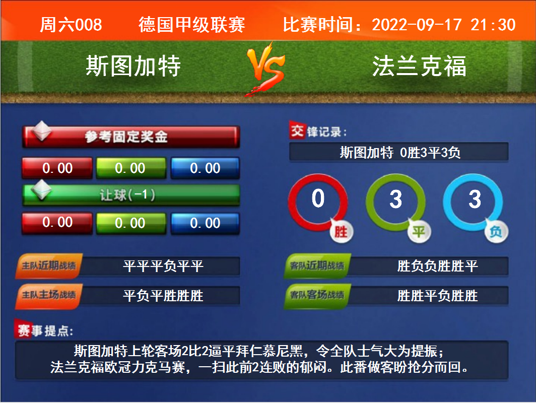 比赛时间:2022-09-17 21:30赛事提点:斯图加特上轮客场2比2逼平拜仁慕尼黑,令全队士气大为提振;法兰克福欧冠力克马赛,一扫此前2连败的郁闷。此番做客盼抢分而回。