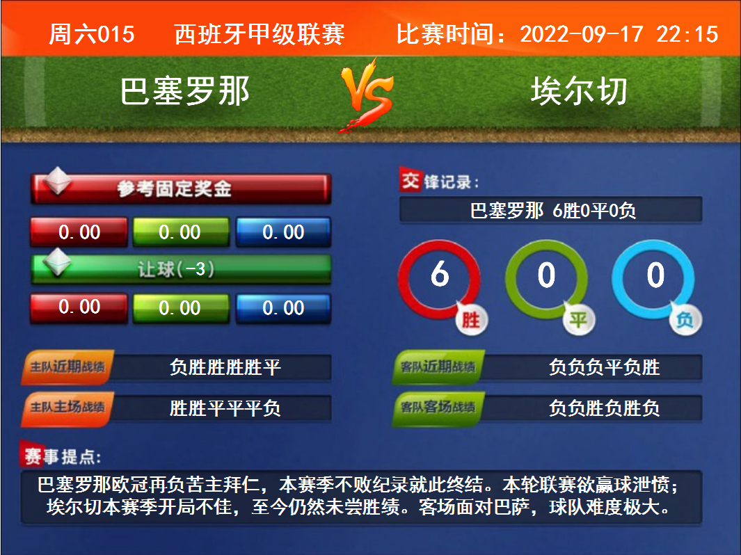 比赛时间:2022-09-17 22:15赛事提点:巴塞罗那欧冠再负苦主拜仁,本赛季不败纪录就此终结。本轮联赛欲赢球泄愤;埃尔切本赛季开局不佳,至今仍然未尝胜绩。客场面对巴萨,球队难度极大。