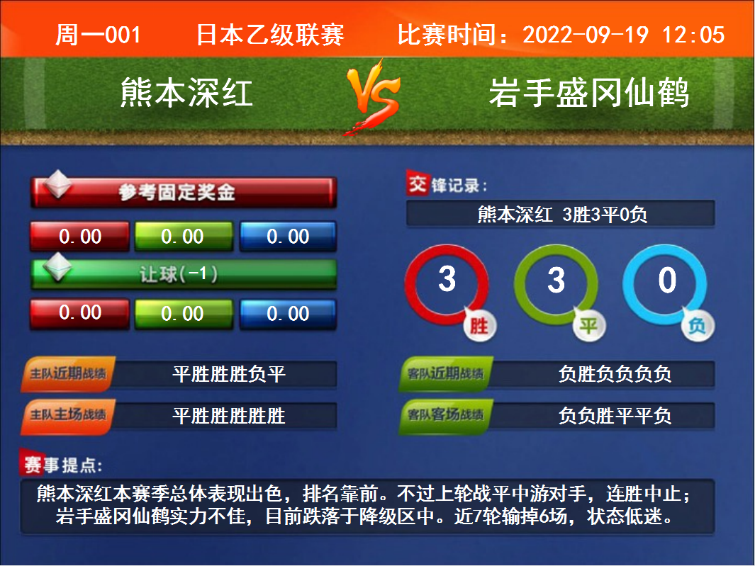 周一001 日本乙级联赛 熊本深红VS岩手盛冈仙鹤