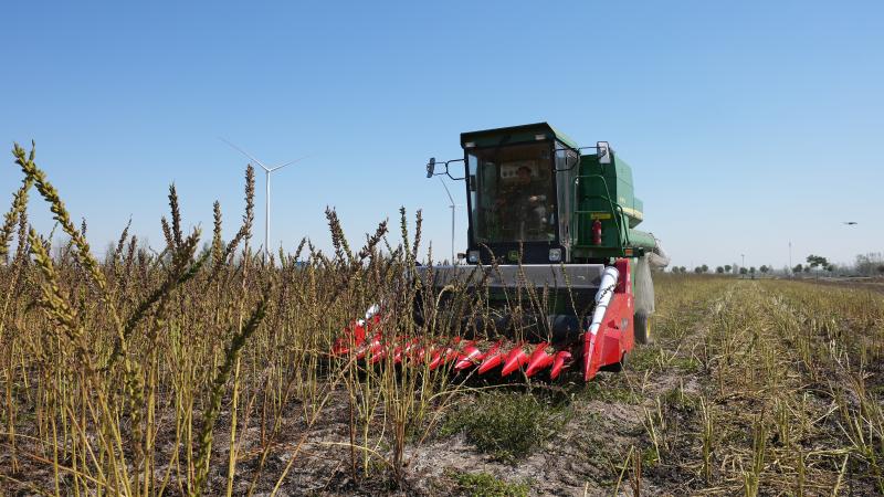 10月10日上午,在项城市李寨镇白芝麻现代产业园,一台芝麻联合收割机来回穿梭,收获已经成熟的白芝麻。此举打破了芝麻不能机收的瓶颈,标志着世界首个宜机收芝麻品种试种成功,芝麻大面积种植成为可能。