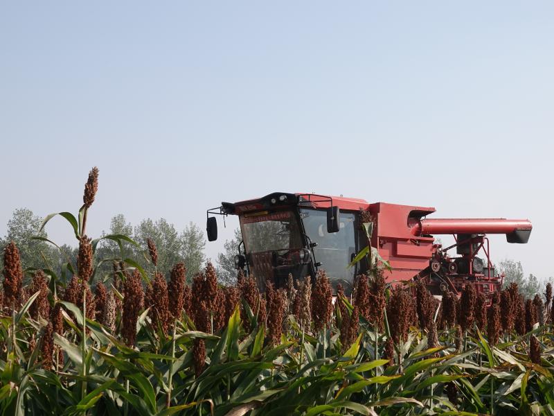 10月12日,走进周营镇孟寨村。偌大的一块高粱地早已被秋风染成了红色。高粱地里,收割机往返穿梭,机械轰鸣,收割着眼前大片大片的高粱“红海”。