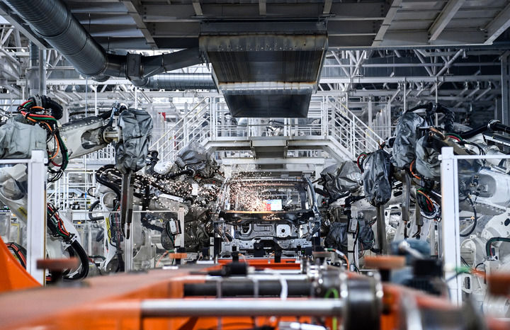 10月17日,在吉林长春中国第一汽车集团有限公司红旗繁荣工厂焊装车间内,焊装机器人在生产线上焊接车身。新华社记者 颜麟蕴 摄