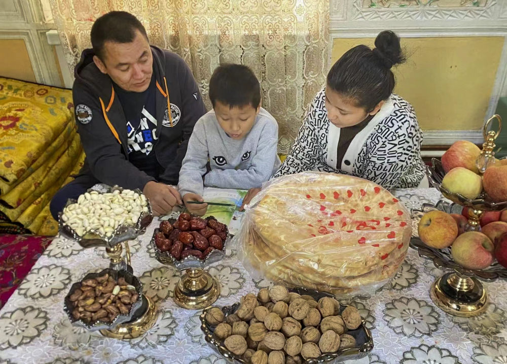10月16日,新疆喀什古城居民阿依先木姑力·阿布来提(右)在家中辅导孩子功课。新华社发(唐努尔·玉麦尔 摄)