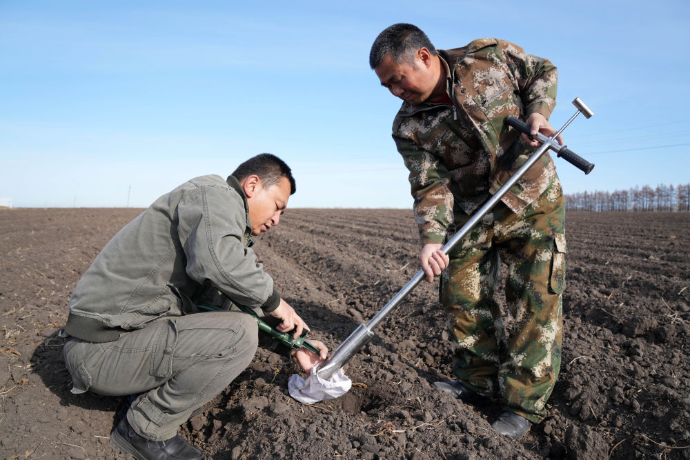 10月20日,北大荒农垦集团有限公司北安分公司赵光农场有限公司技术人员在取土样。新华社记者 王建威 摄
