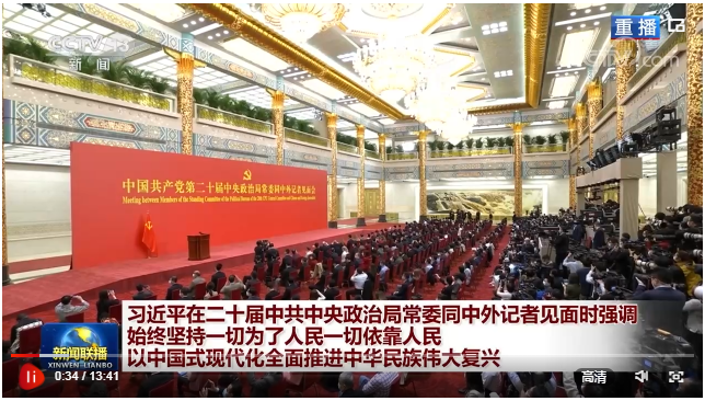 刚刚在中国共产党第二十届中央委员会第一次全体会议上当选的中共中央总书记习近平和中共中央政治局常委李强、赵乐际、王沪宁、蔡奇、丁薛祥、李希,23日中午在人民大会堂同采访中共二十大的中外记者亲切见面。
