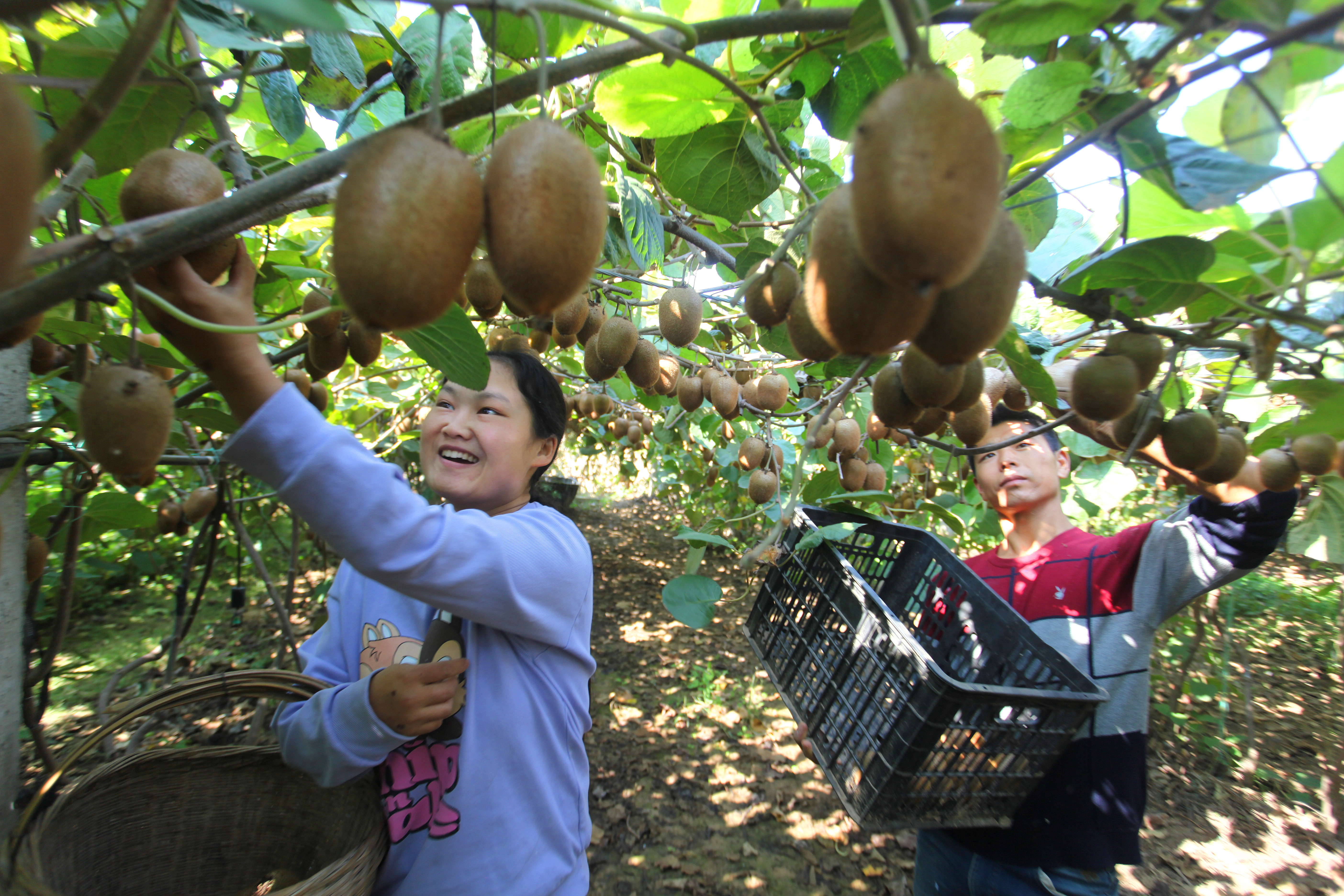 昨日,在商水县邓城镇牛张村猕猴桃种植基地,果农正在采摘猕猴桃。近年来,该县工商联积极引导返乡农民工依托当地资源优势,采取“公司+合作社+农户”的合作模式,因地制宜发展猕猴桃、葡萄、草莓等特色水果产业,助力农业增效和农民增收。③6