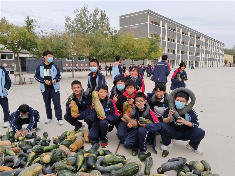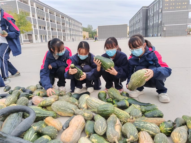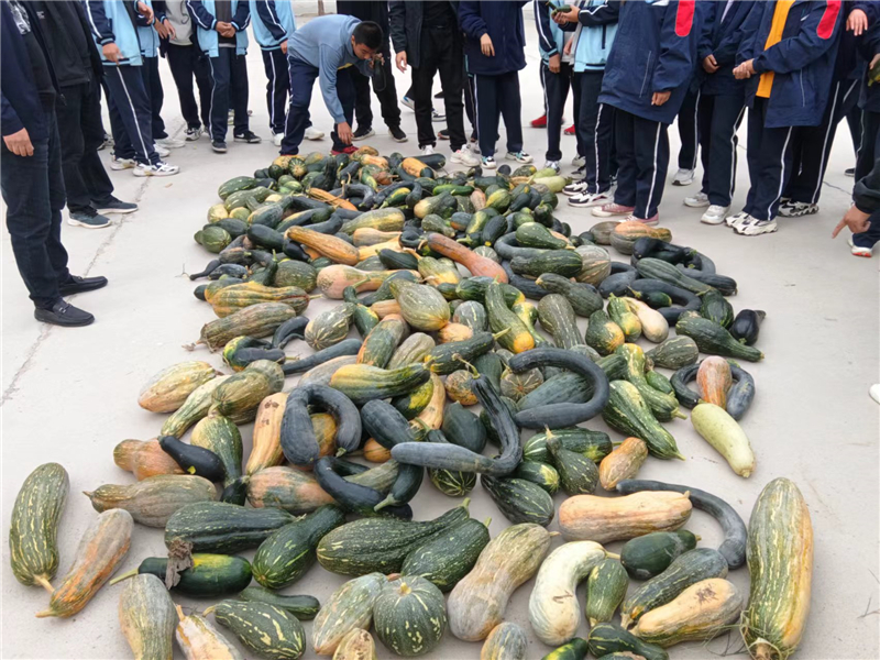 该校区学生农场是学校利用学校的废地开垦的,既绿化了环境,又培养了学生的劳动技能。从春天开始,这里各样农作物在学生的悉心照料下,直到今天的喜获丰收,这是一个享受幸福的过程。根据学校安排,今天课外活动,学校师生纷纷来到农场,有的忙着摘取成熟的南瓜,有的在运送南瓜,现场十分热闹。