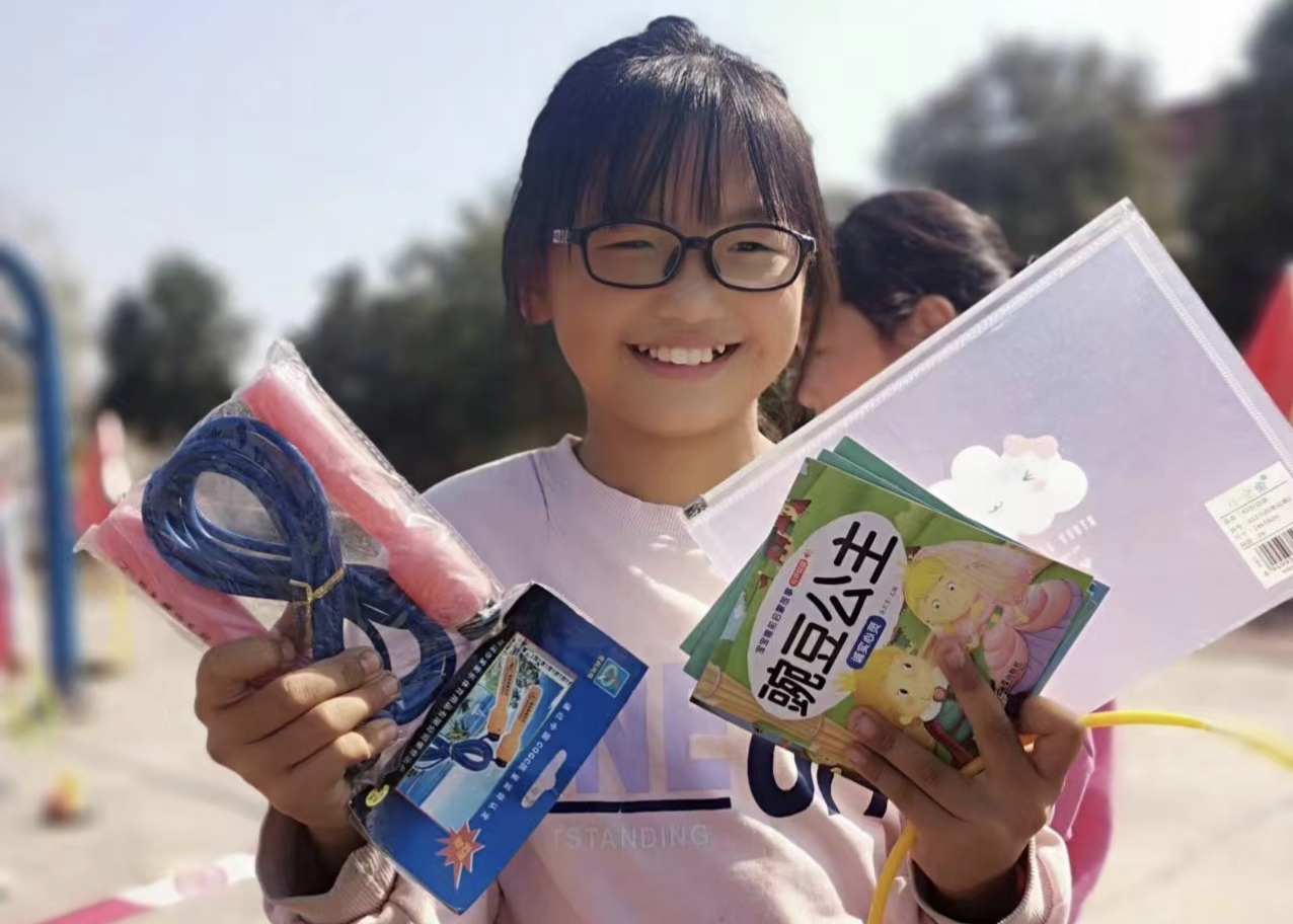活动现场,套圈、摸奖、幸运大转盘、冲锋枪射击体验等趣味游戏花样繁多,孩子们跃跃欲试。同时,一张张课桌上摆放着童话书、跳绳、牛奶、火龙果等各式各样的小物品。