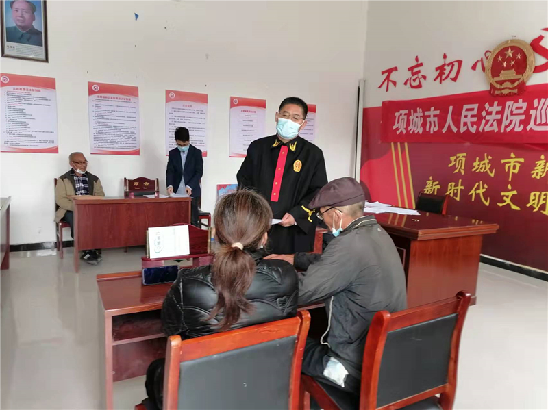 10月29日一大早,牛凌峰带着书记员和国徽、原告、被告牌子等直接驱车赶到新桥镇南村行政村。挂上“项城市人民法院巡回法庭”横标和国徽,摆放好原告、被告、书记员牌子,牛凌峰庭长换上中华人民共和国法官袍开始了庭审。整个庭审现场庄严肃穆。