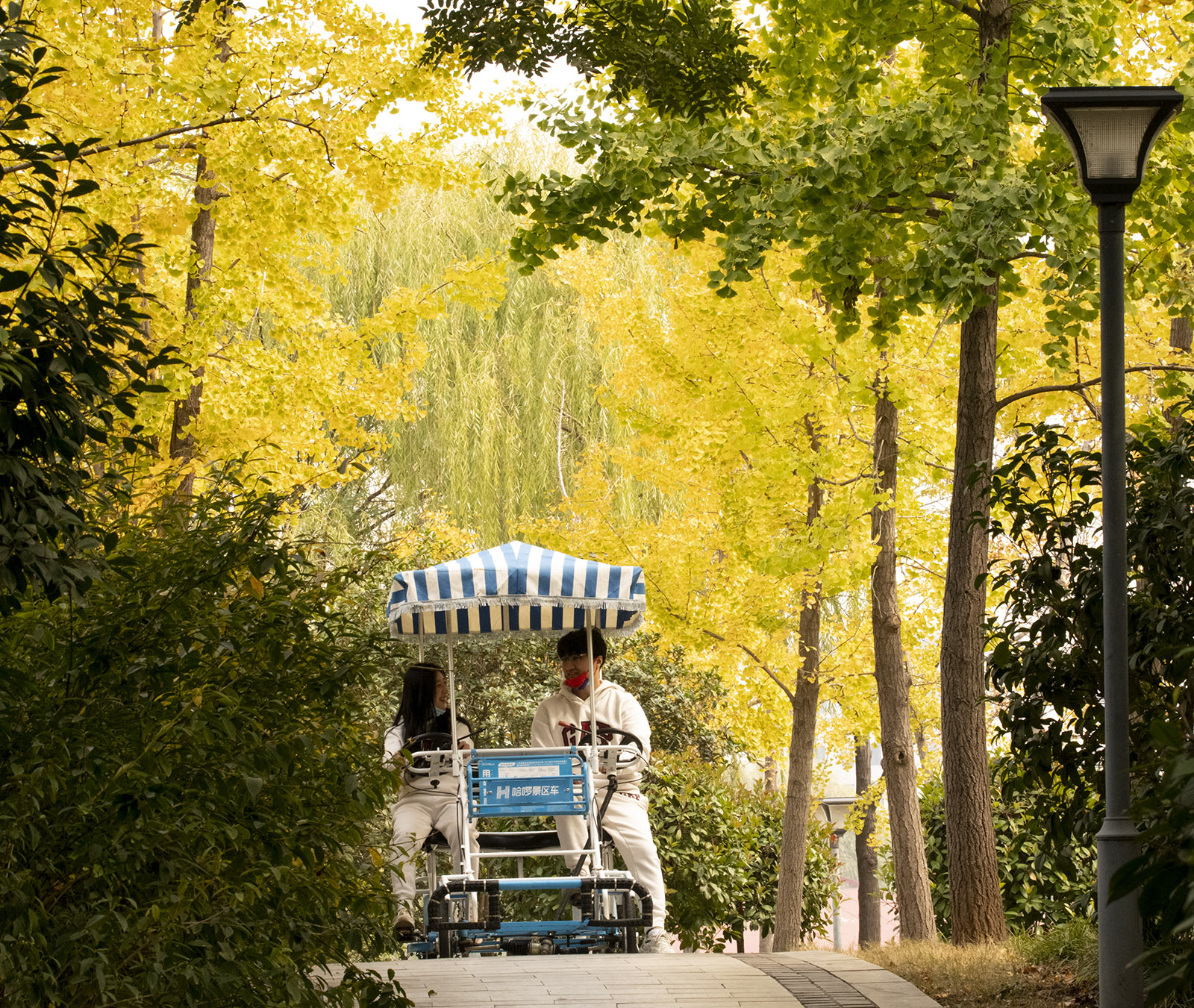 两个青年共踩一辆车在周口公园的银杏树下游玩